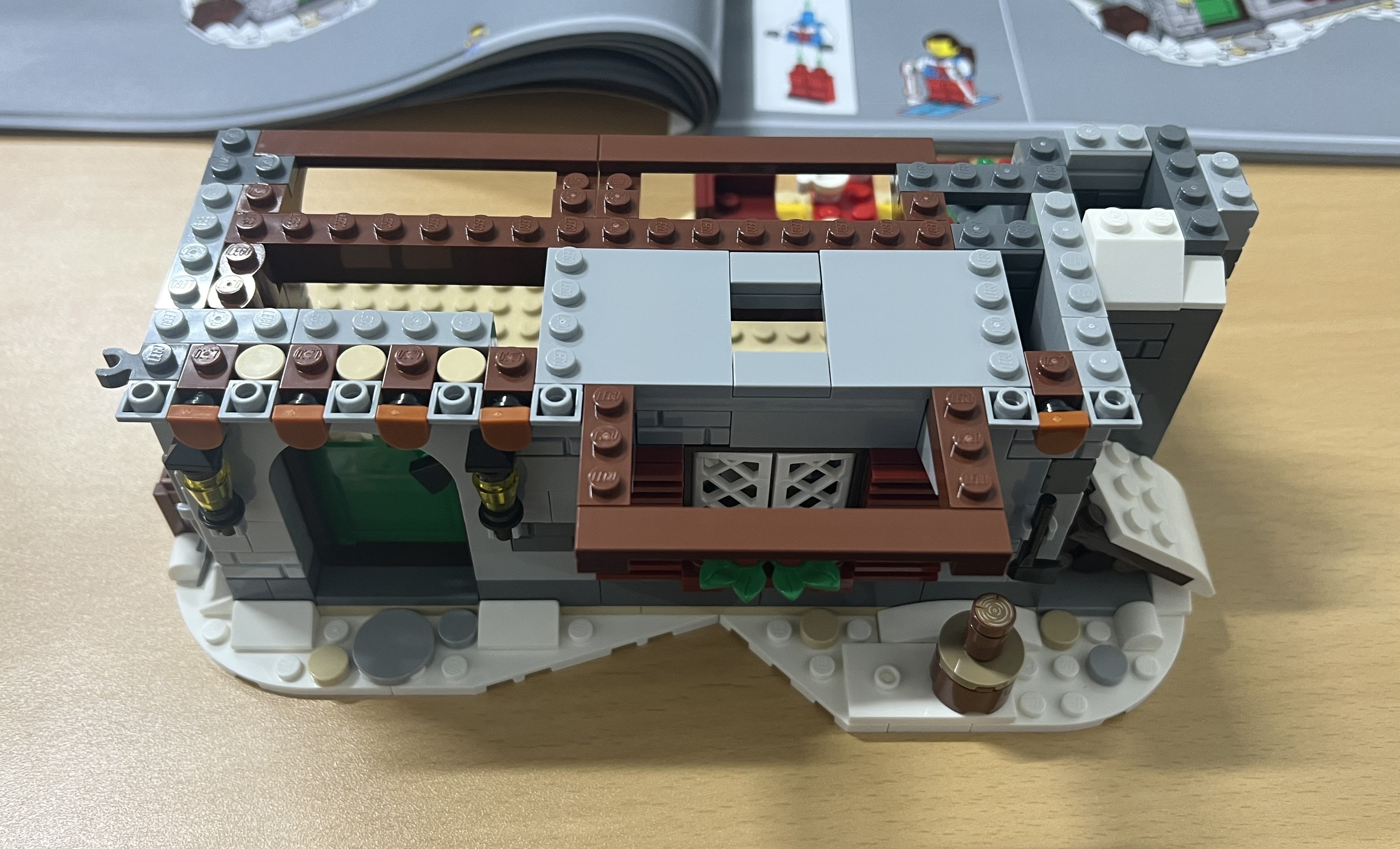 조립하는 방식은 아이스 링크, 스노우 모빌, 앞 창고를 조립한 후 메인 건물을 밑에서 위쪽으로 조립하는 방식입니다. 화목난로가 1층에서부터 3층까지 연결되어 위쪽을 누르면 불빛이 나오는 디테일이 저는 너무 좋았습니다.
