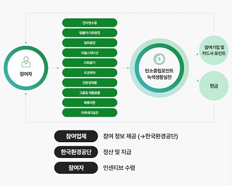 탄소 중립 실천 포인트는 시민들의 탄소중립 실천을 위해 민간기업의 친환경 실적에 따라 인센티브를 지원하는 제도입니다. 우리가 일상생활에서 많이들 사용하는 일회용 컵, 일반 영수증 등 이러한 일회용품들 대신 다회용 컵과 전자영수증 발급 등을 하여 탄소 중립을 실천하게 되면 일정 금액을 적립해 카드사 포인트나 현금으로 환급 받을 수 있는 제도입니다. 참여자가 탄소중립을 실천하게 되면 탄소중립 포인트가 쌓이게 되고 포인트를 인센티브로 수령할 수 있습니다.