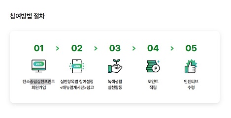 참여 절차로는 탄소중립 실천 포인트 회원가입을 하고 항목별 참여 설정을 하여 실제로 녹색 생활을 실천하면 포인트가 적립됩니다.