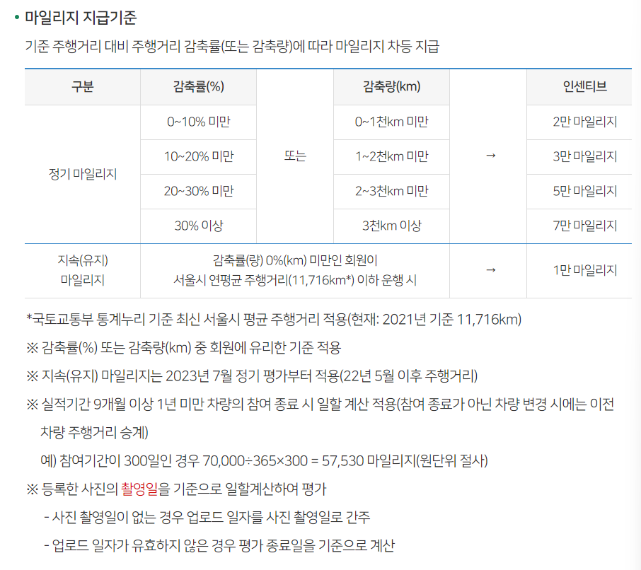 감축 실적은 %로 계산되거나 KM로 계산됩니다. 기준 거리는 등록 1년 이상 된 차량은 최초 자동차 등록일로부터 최초 누적 주행거리 제출일까지의 연평균 주행거리로 계산됩니다. 등록이 1년 미만인 차량은 가입일 기준 전년도 교통안전공단 공표 서울시 자동차 평균 주행거리로 계산됩니다.