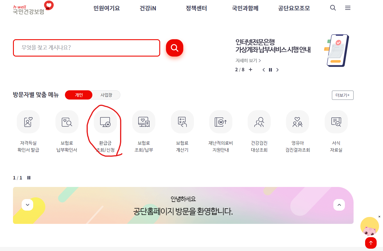 들어가시면 바로 환급금 조회/신청 클릭하셔서 로그인하시면 바로 환급금 확인이 가능하고 신청도 바로 할 수 있습니다.