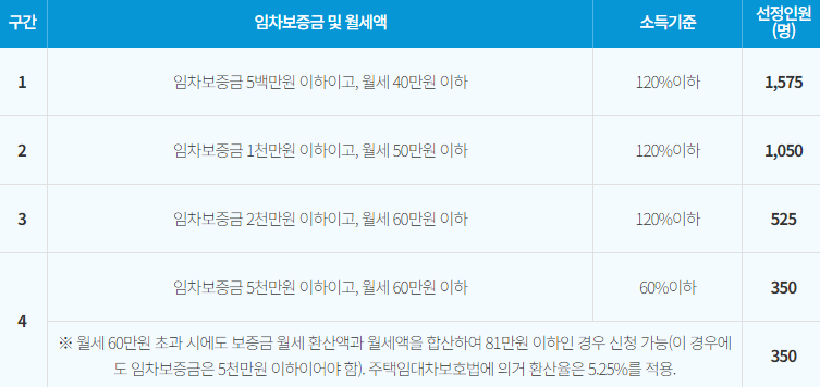 지원 자격은 무주택 청년 1인 가구 중 기준 중위소득 150% 이하를 신청 대상으로 하며 3500명을 선정합니다. 주민등록등본상 만 19~39세 이하인 형제, 자매 또는 동거인이 있는 경우도 지원할 수 있으며 셰어하우스 등에 함께 거주하며 임대사업자와 각자 임대차계약을 체결한 경우에도 개인별로 신청할 수 있습니다. 기준중위소득은 신청인이 속한 가구의 2023년 건강보험료 부과액을 기준으로 합니다.